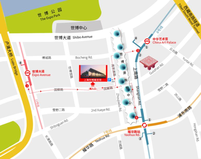 地铁导航定位:东浩兰生上海世博展览馆 地铁8号线中华艺术宫站3号口 步行500米