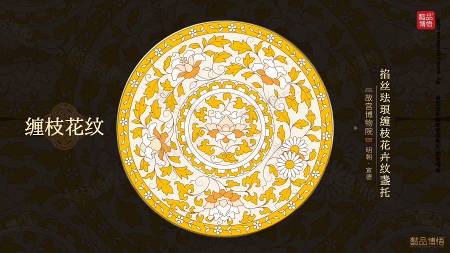 藏于故宫博物院的明朝・宣德掐丝珐琅缠枝花卉纹盏托,便是这份春意的绝佳载体。缠枝纹在明代本就盛行,多见于明锦、瓷器装饰,因花茎攀援延伸、四面舒展的网状结构,又得名 “串枝花”“长青藤”,与独立折枝的 “折枝花” 形成鲜明对比。