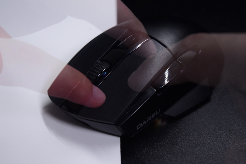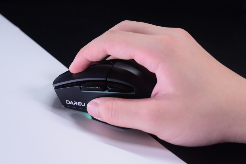达尔优A955游戏鼠标可以很容易看出是一款右手鼠,鼠标左右按键有一定角度的高度差,左侧裙也设有突出的拇指托部分。