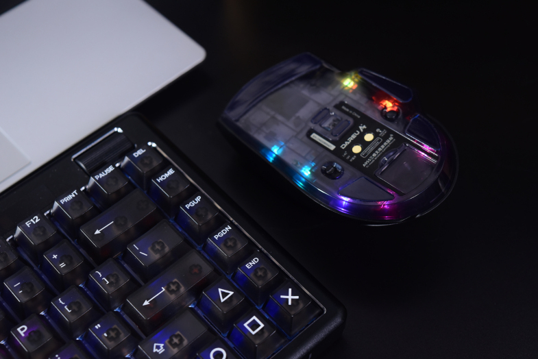 这次A955的一大特色就是透明底座,白色版本会更透,能清晰看到鼠标主板,而黑透版本就没那么清晰,因为是三模版本而且带充电底座,所以底部设有模式切换键,光头下面也有磁吸座充的金属触点。