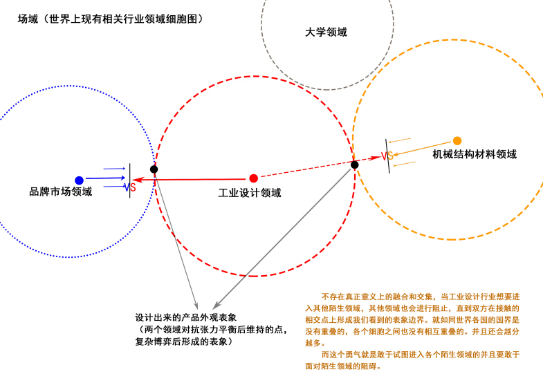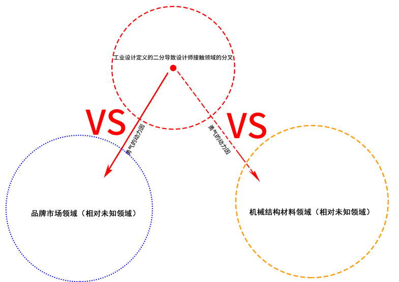 但是想要进入这两个领域,说着轻巧,做着困难,每一个新的领域并不是那么容易接触的,我们想接触进入这个新的领域,但是这个新的领域本身会自我反抗,这个新领域的主体自身会说我凭什么要让你工业设计师进入这个领域。你工业设计行业休想认识我。在两者作用力和反作用力(张力)的相互拉扯中,进入这两个新领域的设计师饱受着折磨。在现实中的体现就是第一种设计提案交稿时的痛苦和反复的改图(品牌领域中的未知,外观语言是否符合企业的战略形象用于引领潮流),第二种为新型结构和技术落地量产时和工业体系本身的扯皮。(机械结构领域中的未知为产品外观是否能从概念的摇篮中在现实中落地)