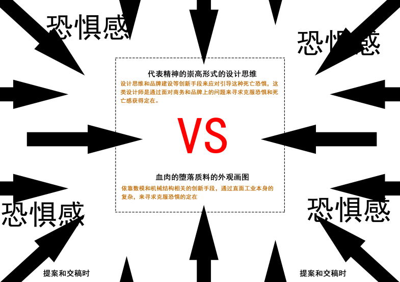 面对上述的恐惧和死亡审判,我们最重要的是需要勇气来面对未知,但是怎么面对呢?怎么获得勇气呢?在工业设计中我们会主要遇到两种恐惧和死亡感。关于设计中的死亡恐惧感主要是设计定义方向二分导致的,因为对设计来说每一个二分所带来的边界接触都是未知的,而未知必然会带来恐惧,而这个相关勇气的定位是工业设计师是否敢于直面上述两种未知领域和行业中的问题,第一种设计思维和解决问题的设计师面对的恐惧主要问题是工业设计行业和品牌营销和品牌搭建行业之间的矛盾,毕竟品牌建设也是一个独立行业,里面的门道有很多,工业设计师想要走入其中未知边界领域太多。第二种外观画图派到最后面对的矛盾主要就是工业设计行业和机械结构行业之间的矛盾,走入这个行业需要扎实和深厚的理工科知识背景和严谨的数学思维,对工业产品设计师来说也是有很多未知的边界领域需要突破和探索。第一种设计师是通过走向管理岗位克服品牌相关内容和知识,最后成为设计创业和管理者,通过创业和成为设计领导面对商务上的不确定性和用户需求的反复来获得勇气的,会觉得我什么大风大浪都见过了,设计商务里面的细节和相关未知我都见识过了,代表人物乔布斯和各类比较大型设计公司创始人和管理者。第二种设计师,他们会走向复杂的工业技术本身,最后走入结构机械设计行业里面。第二种设计师在面对恐惧时他们更多的通过接触结构和机械知识走入工业系统本身的复杂性中来面对这种工业的复杂,通过面对复杂的工业体系来克服死亡的恐惧感从而获得勇气,他们内心会说,我现在有勇气面对任何复杂的工业产品本体了,从内部的螺丝钉到最后的外观。当然还有很多第二种工业设计师,但是他们大多都是无名的。只有少数寥寥数位知道他们的存在。