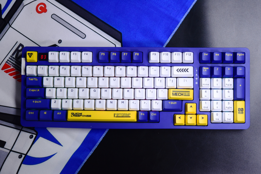 达尔优A98可以说是在硬件配置上到顶的一把机械键盘,而机甲版的外观配色也很有感觉,在大键上都有机甲风的元素图案搭配,很能突出机甲风的设计。