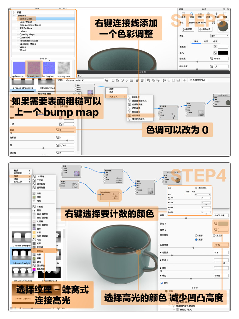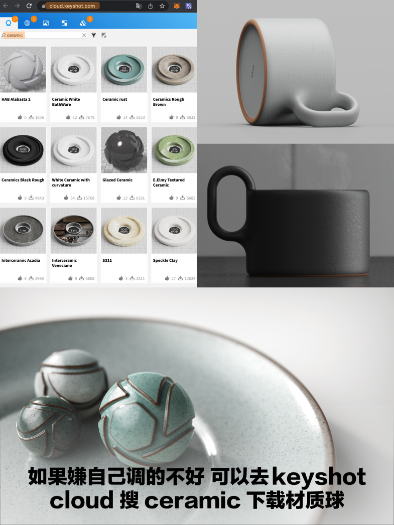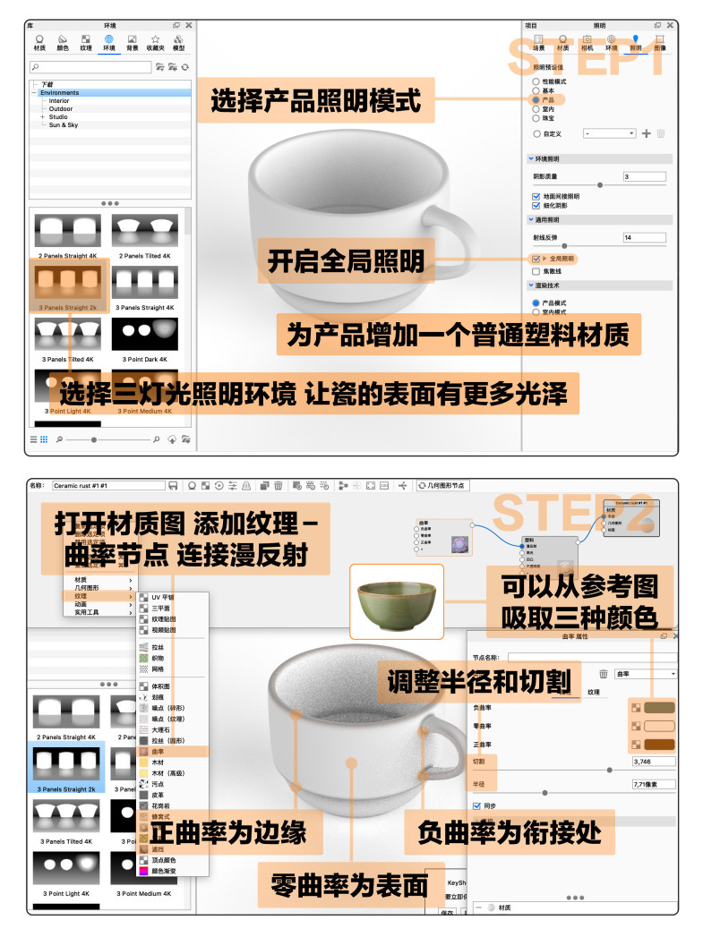 🟠 首先在keyshot里打开产品模式,开启全局照明,开启三灯光照明环境让产品表面有更多光泽(用HDRI来调光也可以),为产品上一个白色塑料材质(也可以用油漆材质)。打开材质图,添加纹理-曲率,连接漫反射,正曲率颜色为边缘,零曲率是产品表面的颜色,负曲率是衔接出,调整半径切割以及三种颜色(可是打开参考图,从参考图吸取颜色,根据自己的需求调整)然后右键连接线添加一个色彩调整,将色调改为0。如果需要表面粗糙可以添加bumpmap/凹凸贴图,缩放贴图即可。然后为产品增加高光表现,右键纹理-蜂窝式,然后连接高光,减少凹凸的高度,右键添加要计数的颜色节点,根据需求调整参数即可。觉得重新新建节点麻烦,大家也可以搜keyshot cloud下载材质球然后根据需求调整。