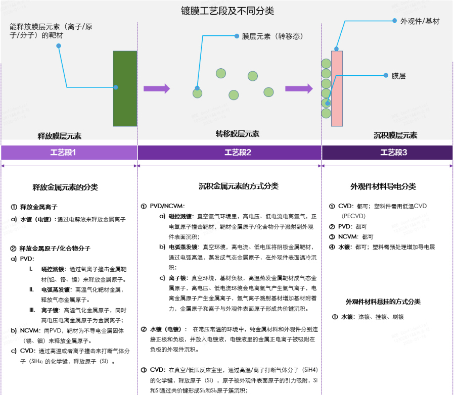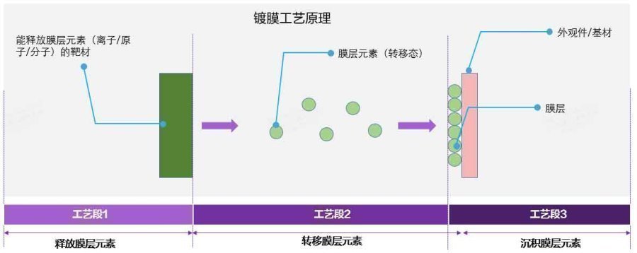 目前镀膜工艺主要包含三个:PVD(物理气相沉积)、CVD(化学气相沉积)和电镀(电化学沉积);