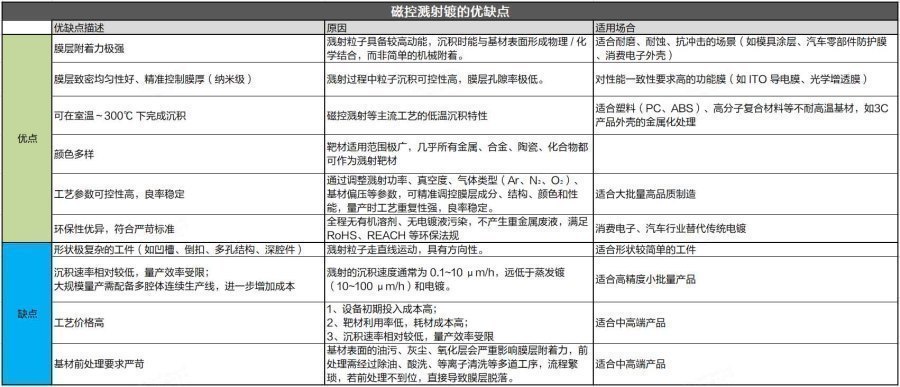 以上就是PVD溅射镀的基本过程和基本原理。根据这些原理和加工过程,我们可以得出PVD溅射镀的优缺点如下: