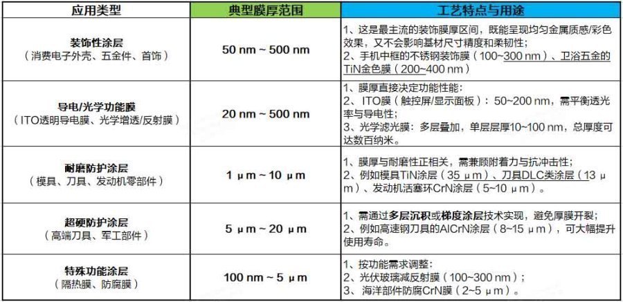 对于我们工业设计师在做设计时,PVD的膜厚会影响外观面的品质,膜厚的总结如下图: