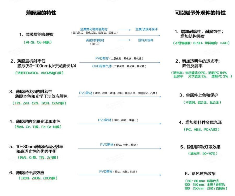 对于设计师来而言,我们选择镀膜的核心目的就是利用薄膜层给外观件增加额外的功能, 我总结了6类功能。这6类功能也是利用了镀膜工艺的5个特性。具体如下图:
