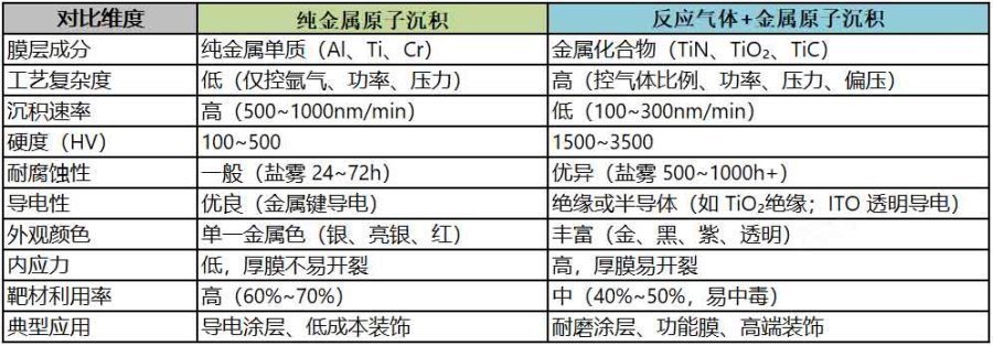 a) 纯金属原子沉积: 通常是Al、Ti、Cr、Cu原子,沉积为纯金属单质。 这种沉积方式的优点是,工艺简单易控,沉积速度高,导电性能好,同时金属质感纯正。同时缺点也很明显,耐磨性差,硬度低,耐腐蚀性有限,膜层的致密性相对较大。