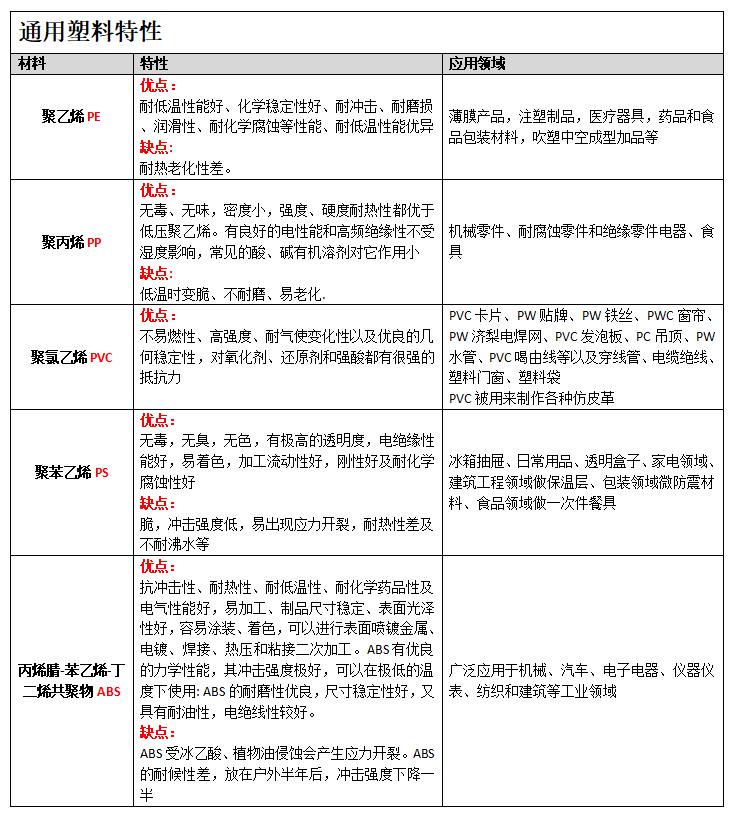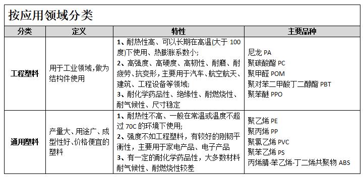 • 按照应用领域分类,塑料可分为工程塑料和通用塑料,如下图