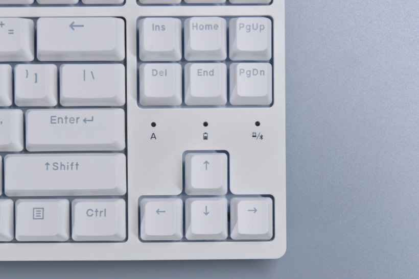 方向键上面的指示灯也变了,第一个大小写指示灯,第二个电量指示灯,第三个2.4G和蓝牙切换指示灯,使用的时候可以更直观地看到键盘的各种状态。