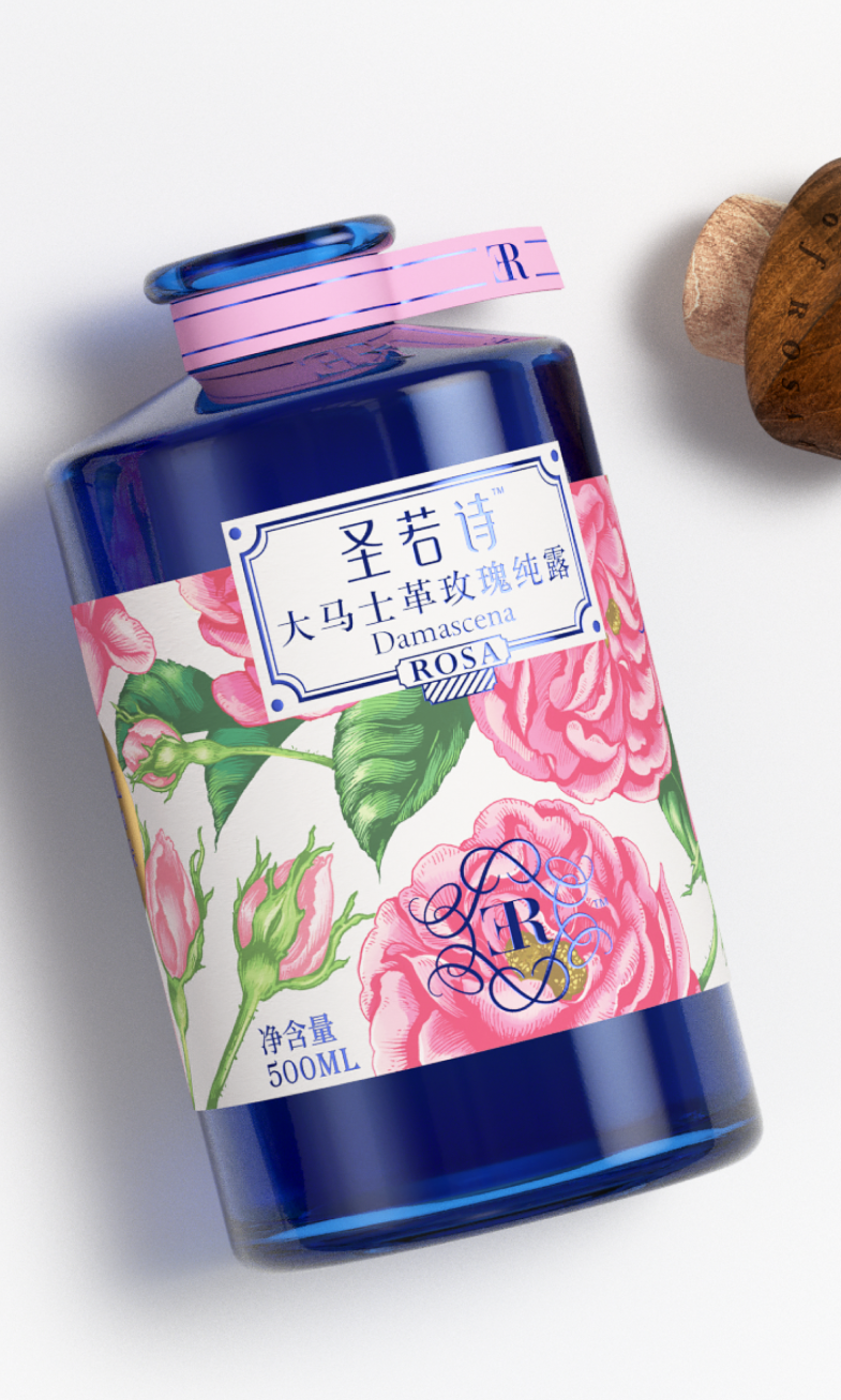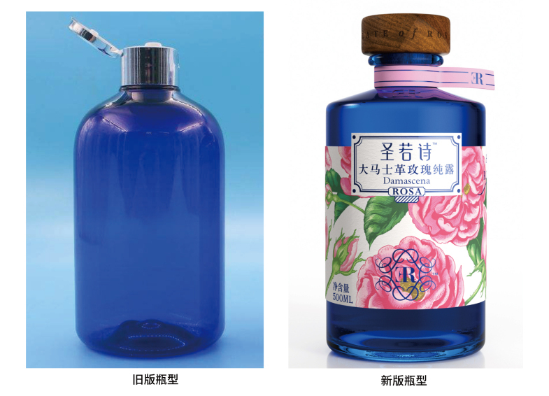 过去的瓶身圆,直径宽。玫瑰纯露的使用者多为追求精致生活的白领女性,很难直接抓握。