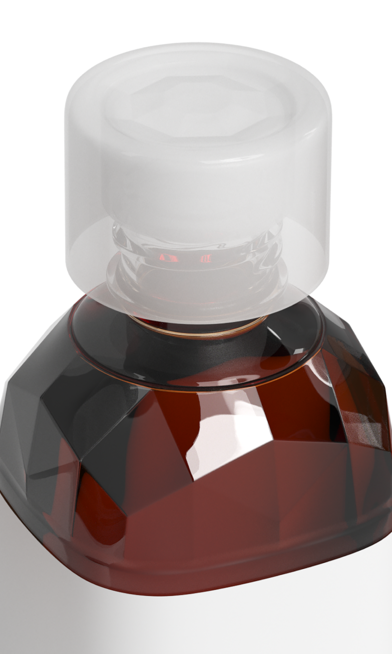 模拟钻石的八面体切割工艺和枕形切割工艺,由于斜线更多,折光角度更大,看起来十分闪耀明亮,强调新派凉茶的品质追求。