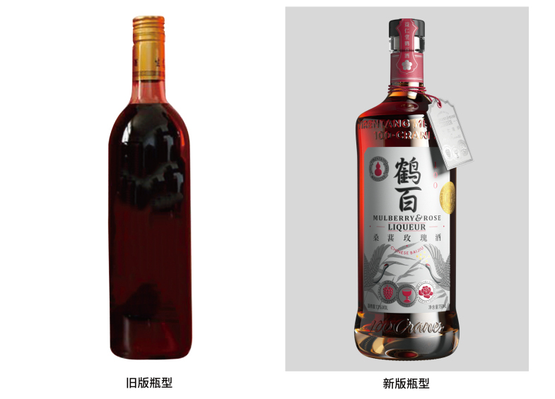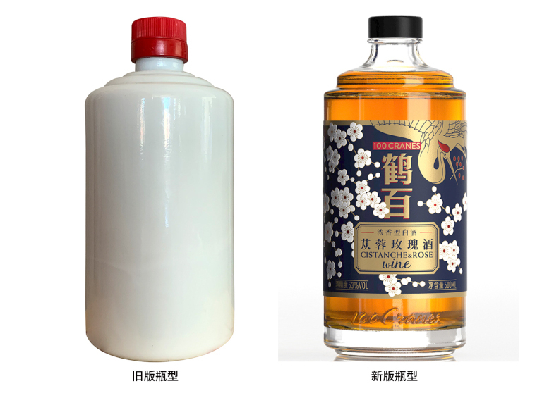 同时瓶底加厚并增加一个层次作为呼应。瓶身改为透明玻璃,这样晶莹剔透的瓶子直接透出金黄的酒体,颇显珍贵和独特,不再遮掩酒体,反而形成独特优势直接展现。