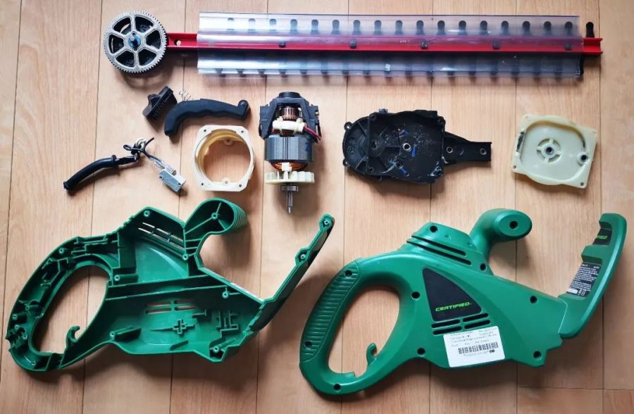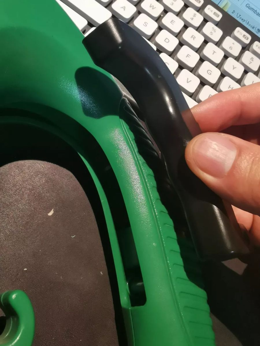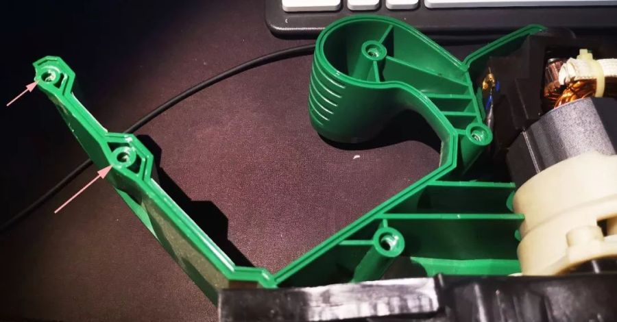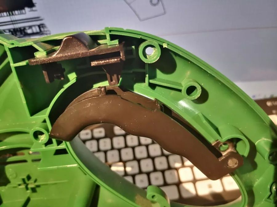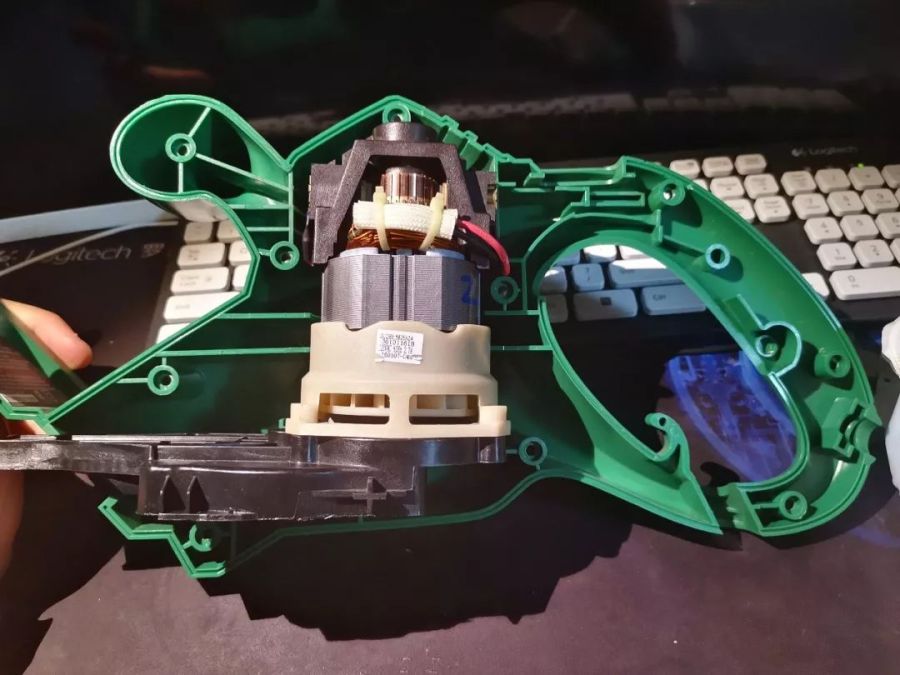 我们先来看它的分壳方式。很好识别,它是左右分壳。左右壳包括了刚才所说到的,上把手和前护板。这样的一体化,只需要两个模具一次成型,还节约了组装的成本。