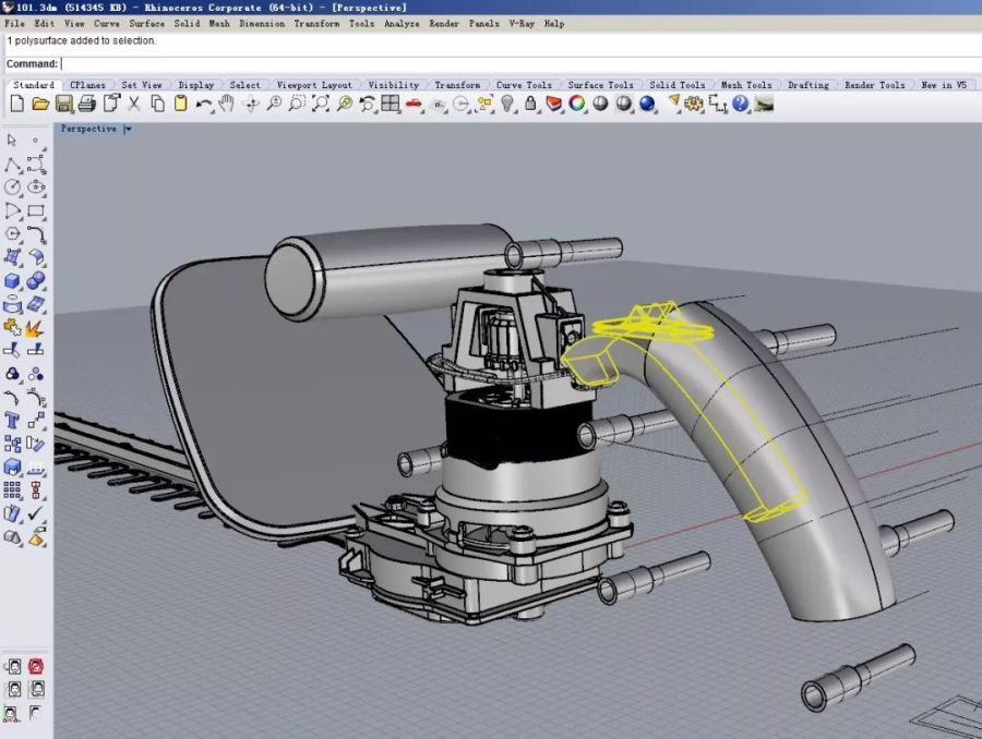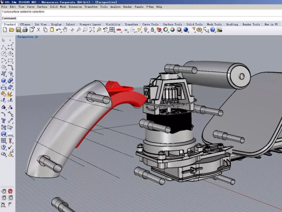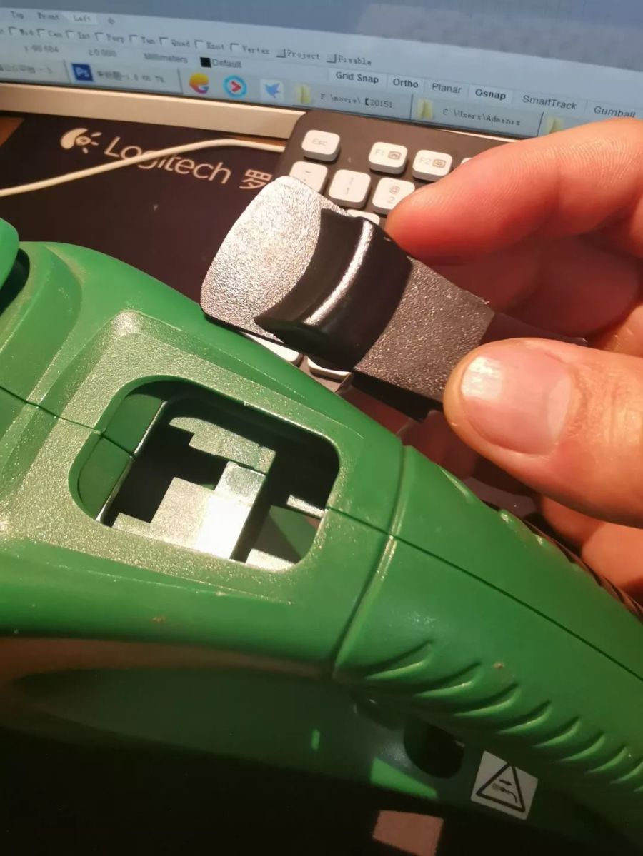 后把手的形态一般都不做修改,因为它已经是抓握舒适度的最佳状态。我们需要的是截取它的抓握区域,放在Rhino里面。角度可以做适当的调整。曲面形态尽量贴合原有产品。(由于没有三维扫描工具,不可能完全一样)