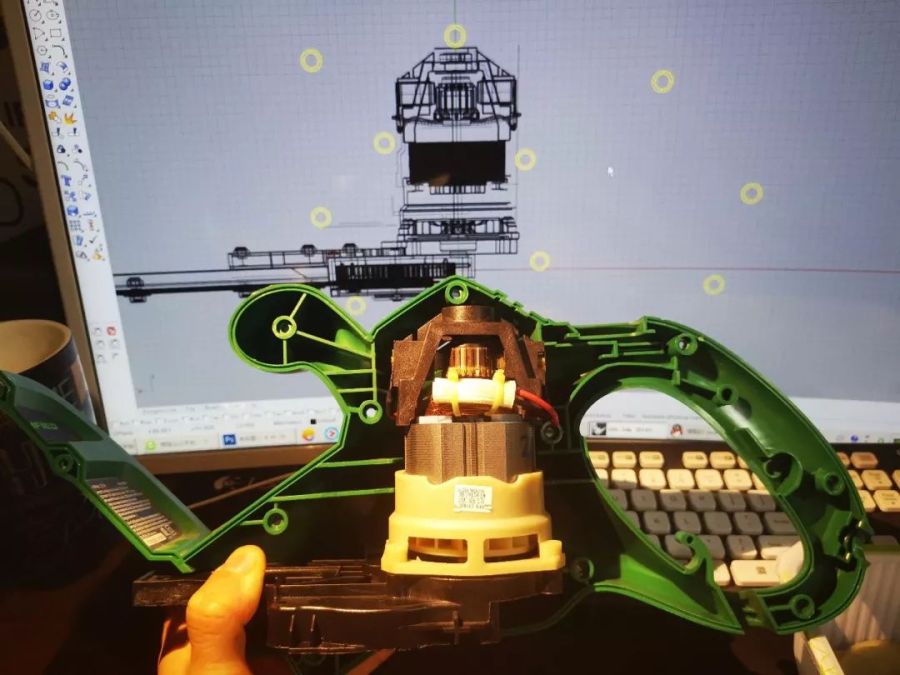 在模型中,我们已经有了内部电机和齿轮箱的位置。然后把实物的电机和齿轮箱放进外壳。这样就能看到螺丝孔位相对电机齿轮箱的位置。