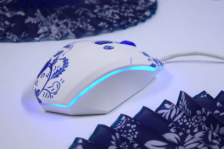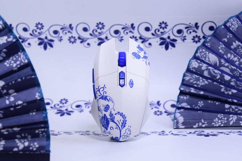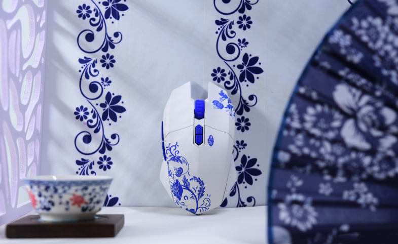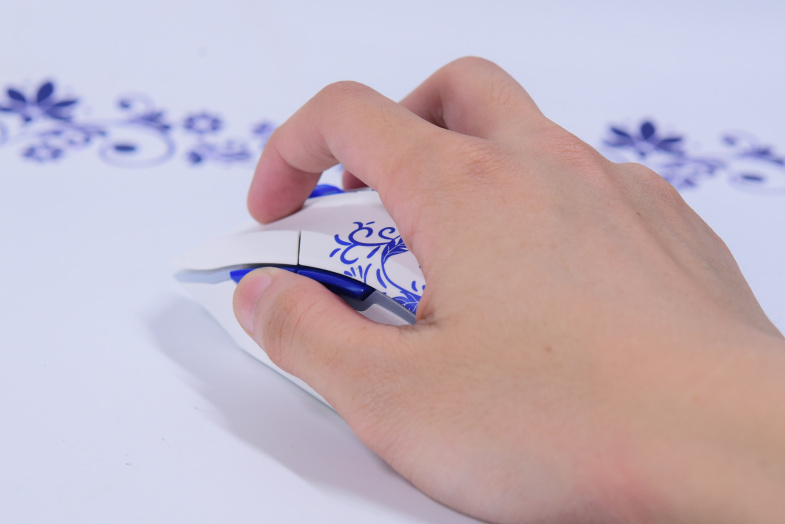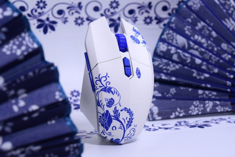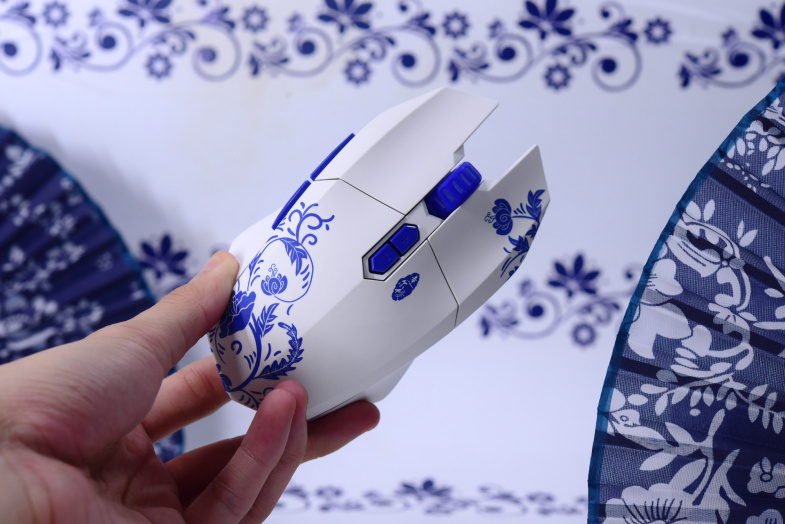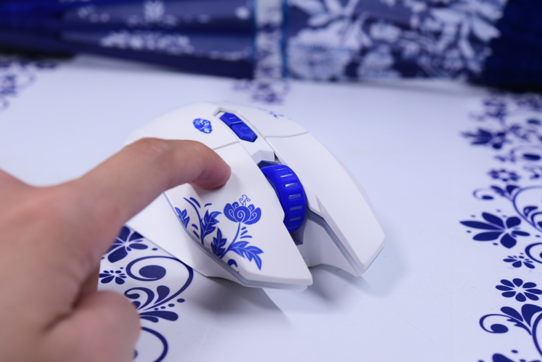 侧键、滚轮、DPI键均为青蓝色,鼠标左下方和右上角有青蓝色花卉图案,DPI键附近还有毛笔字体的繁体达尔优字样。不得不说,达尔优的鼠标键盘一旦隐藏了LOGO就会颜值提升百分之五十以上。鼠标表面为了日常使用的触感采用类肤质处理,如果要提升外观青花瓷质感用镜面处理可能会更棒。