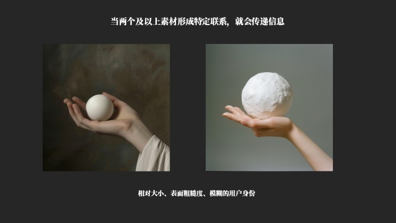只看一张图,由于球和手的对比,我们可以知道球的相对大小。同时看两张图,又会感受到两者对比带来的差异性。图片由midjourney生成。