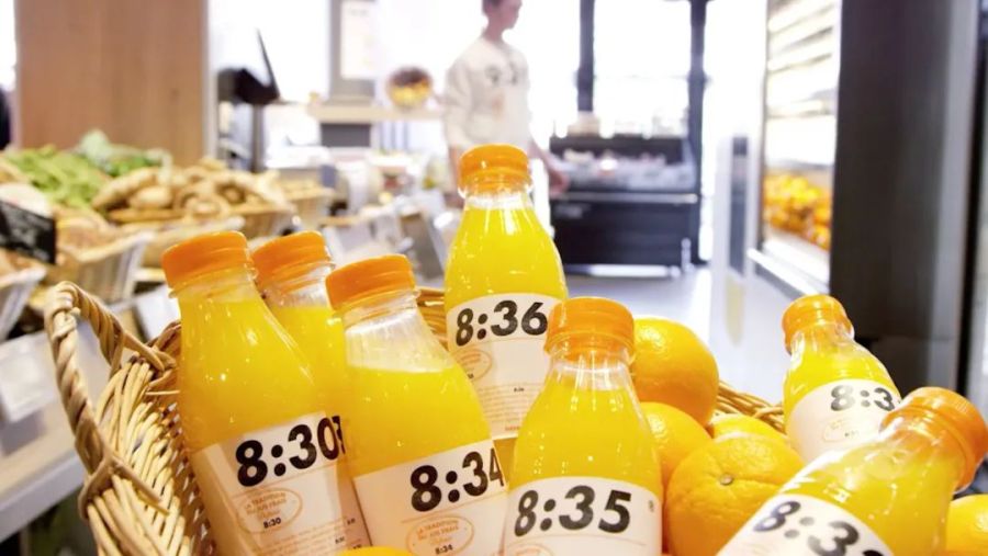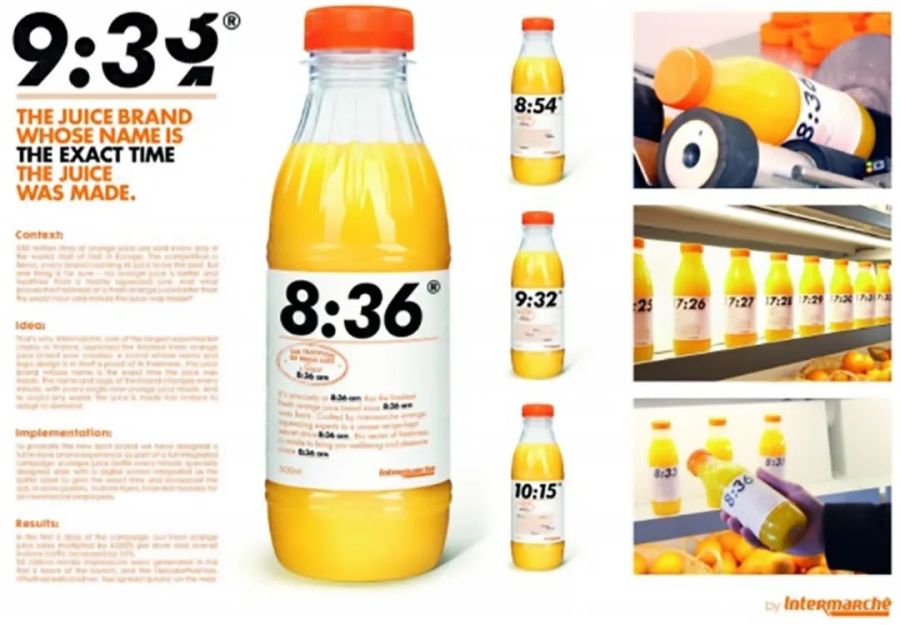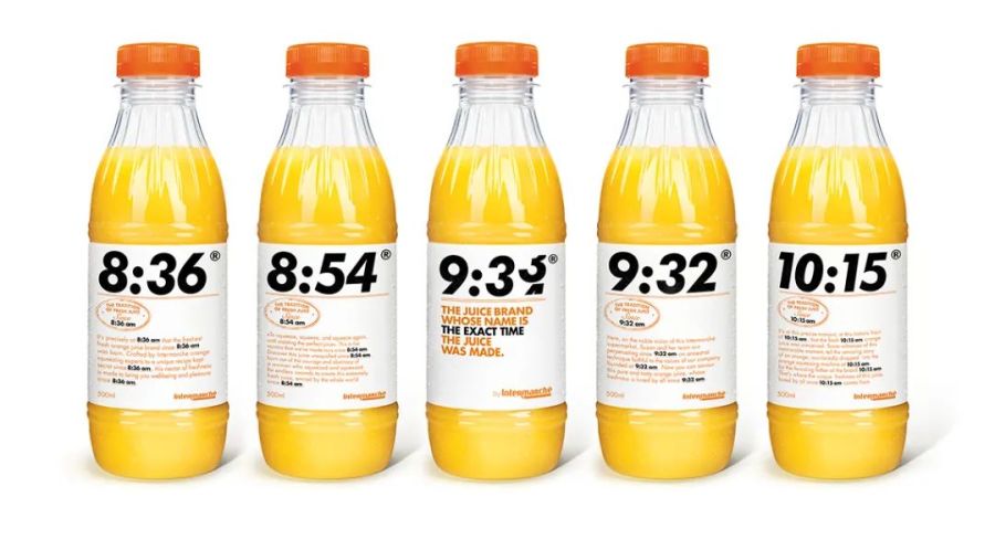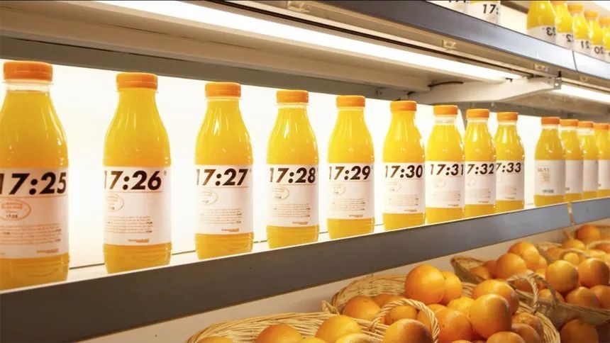 法国一家连锁超市Intermarché,为了进一步体现出“新鲜”二字,在每瓶橙汁的包装上都用白底黑字印上了超大的数字时间。