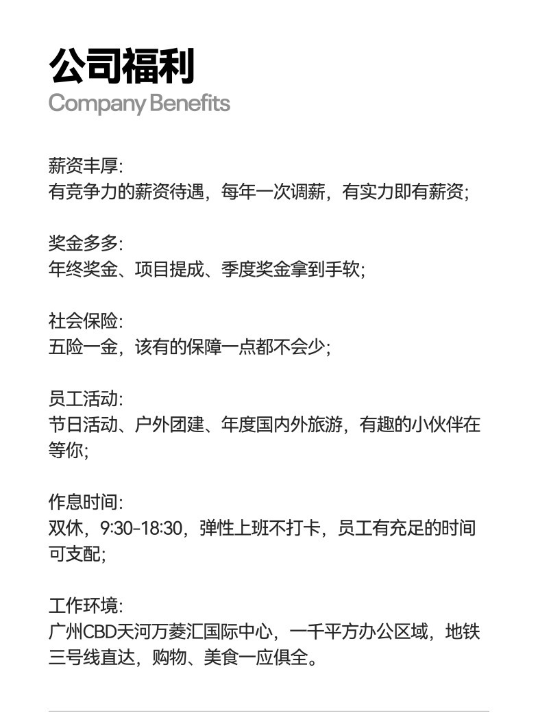 在Designest,我们深知员工的价值。因此,我们实行弹性上班制度,不打卡,让员工拥有更多自主支配的时间。同时,我们提供丰厚的薪资待遇,以及月度生日会、节日活动、季度户外团建、年度国内外旅游等多样化福利,让您的能力与付出得到应有的回报。