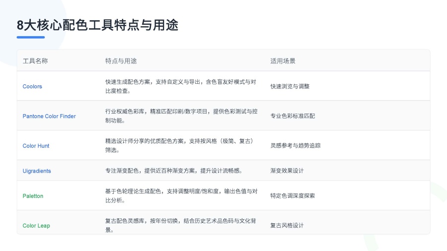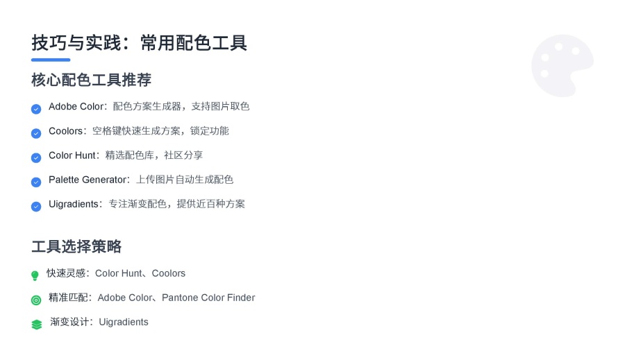 实用工具:使用在线配色工具(如Adobe Color)获取基于色轮理论的协调配色方案(类比色、互补色、分裂互补色等)。