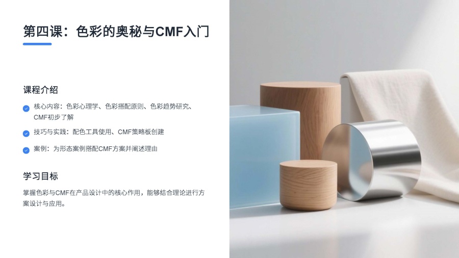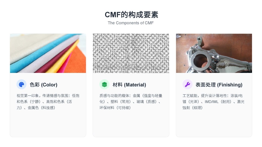 色彩、材料与表面处理(CMF)是产品设计中塑造情感、品质与品牌辨识度的核心手段。它们将冷硬的模型转化为富有生命力的产品。本课将带你系统理解CMF的基础知识,掌握这套塑造产品灵魂的“组合拳”。