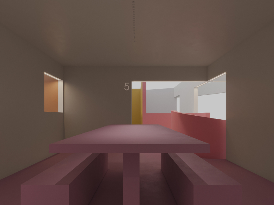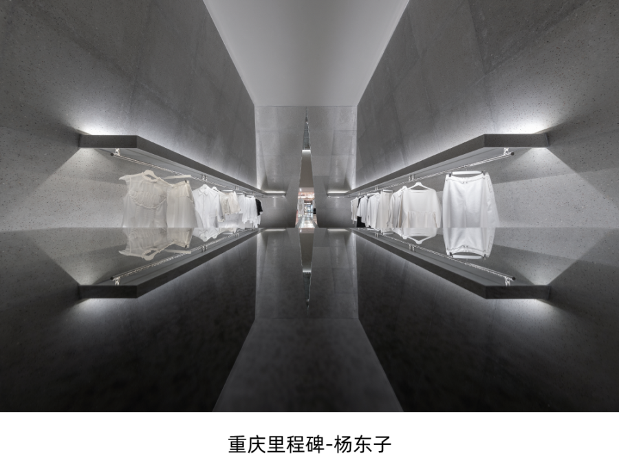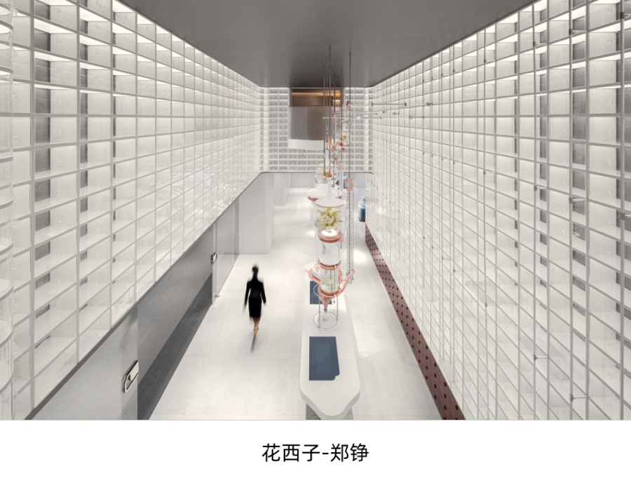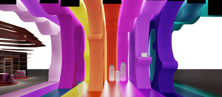在展厅的设计中,设计师尝试将博尔赫斯小说《小径分岔的花园》具象化,如同莫比乌斯环有着无穷的动线,用色彩与材质来区分不同的区域,不同的色彩象征着不同的心境。让人们在里面自由的行走,分岔,休憩,以及再次相遇。