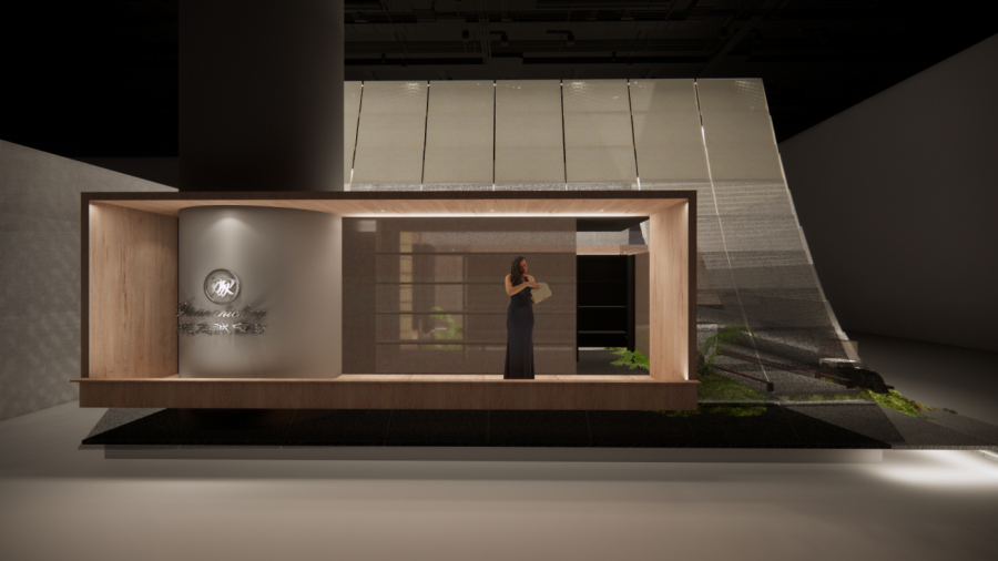 展厅被命名为「凭栏水榭」,设计将建筑美学与布艺美学相结合,通过对岭南文化语言的转译,实现跨学科的美学结合。展馆由低平的台,围合出一个个空透,畅达的展示「水厅」,营造出独属于岭南园林的特色氛围,使观赏者可以在由布艺为主题材料的空间闲庭漫步。