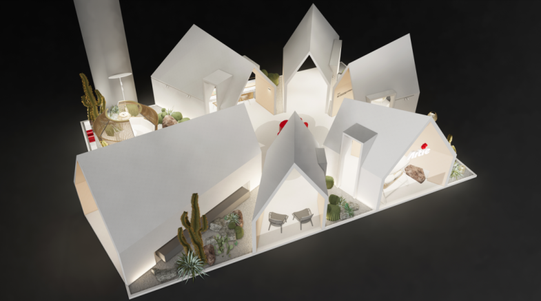 由超级平常策展设计的主场馆,以“产品连接观展人群,展示美好生活”为愿景,试图解决以往展会人群拥挤、展馆排队、观展疲惫的痛点,打造开放的市集体验。构建「微型村落」逛市集般的体验,多层次的展览流线,将人流引导到展区的各个角落,构成可自由探寻的展览路径体验。
