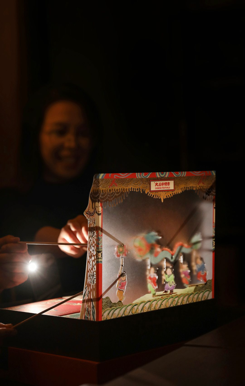 开盖后,将幕布沿着盒型的拐角一卡,礼盒就变成了戏台。