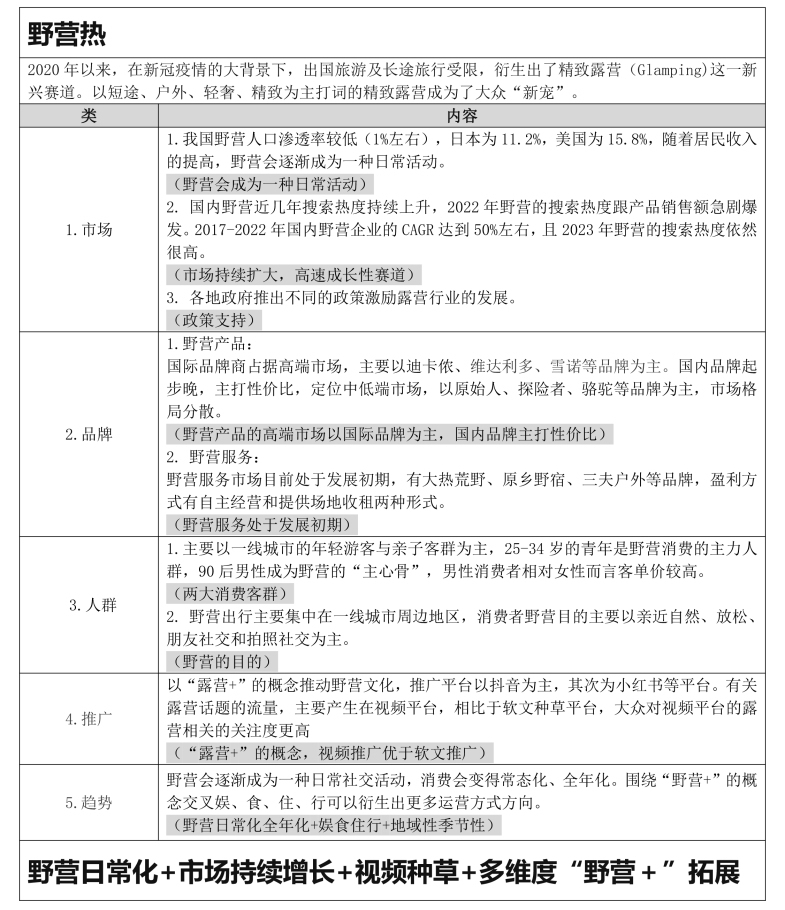 • Glamping精致露营是疫情背景下催生的新兴赛道,以下是对于野营市场趋势的调研见解: