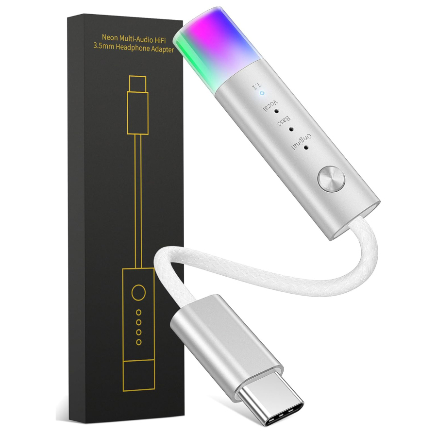 8、这是一款手机高保真音频转接器,用铝型材+伴随音乐跳动的彩色灯效呈现产品的科技感与趣味性。适合听音乐或玩游戏时追求不同音效的用户人群, 可以选择原声模式 / 低音增强 / 人声聚焦 / 7.1 环绕声,简单操作一键切换,精准匹配不同使用场景。解决了当下主流数码设备取消 3.5mm 音频孔后,用户使用传统有线音频设备的兼容性与音质损耗问题,兼顾日常使用的实用性与音频体验的专业性,适配手机、平板、笔记本、台式机等多设备场景的音频需求。