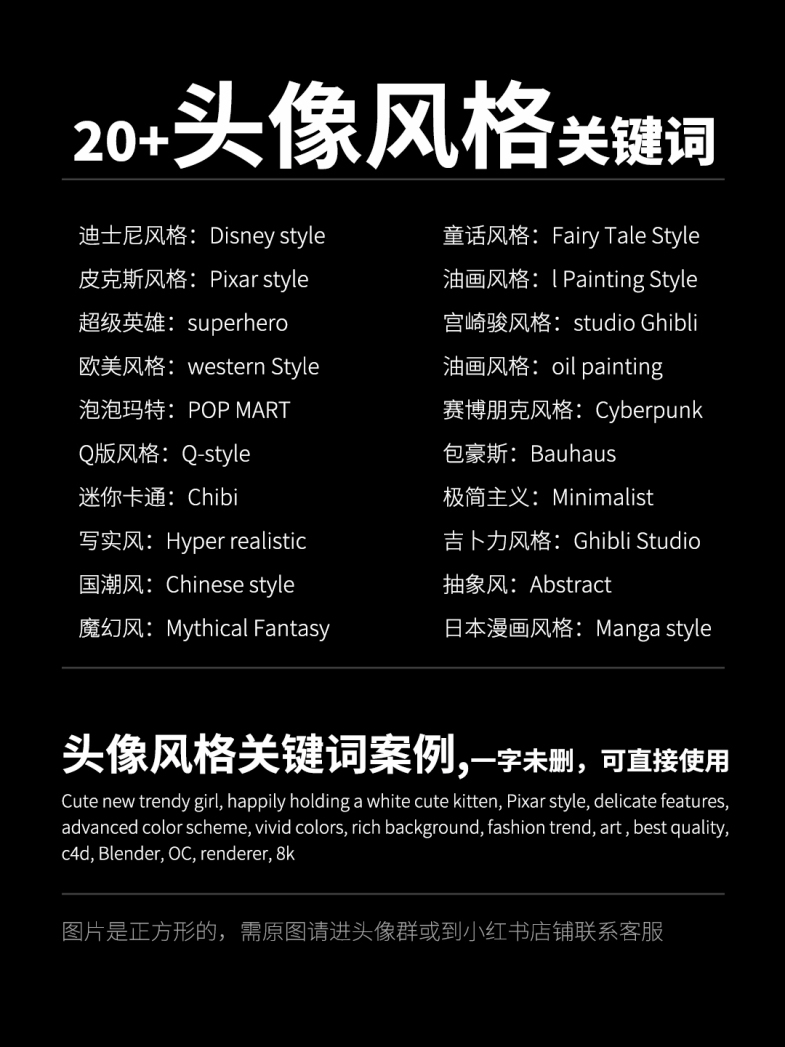 1.迪士尼风格:Disney style 2.皮克斯风格:Pixar style 3.超级英雄:superhero 4.欧美风格:western Style 5.泡泡玛特:POP MART 6.Q版风格:Q-style 7.迷你卡通:Chibi 8.写实风:Hyper realistic 9.国潮风:Chinese style 10.魔幻风:Mythical Fantasy 11.童话风格:Fairy Tale Style 12.油画风格:l Painting Style 13.宫崎骏风格:studio Ghibli 14.油画风格:oil painting 15.赛博朋克风格:Cyberpunk 16.包豪斯:Bauhaus 17.极简主义:Minimalist 18.吉卜力风格:Ghibli Studio 19.抽象风:Abstract 20.日本漫画风格:Manga style