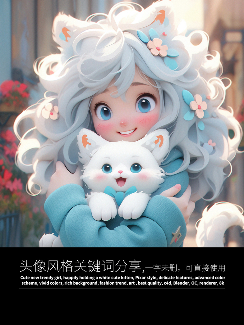 Cute new trendy girl, happily holding a white cute kitten, Pixar style, delicate features, advanced color scheme, vivid colors, rich background, fashion trend, art , best quality, c4d, Blender, OC, renderer, 8k