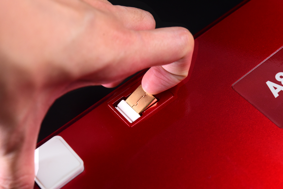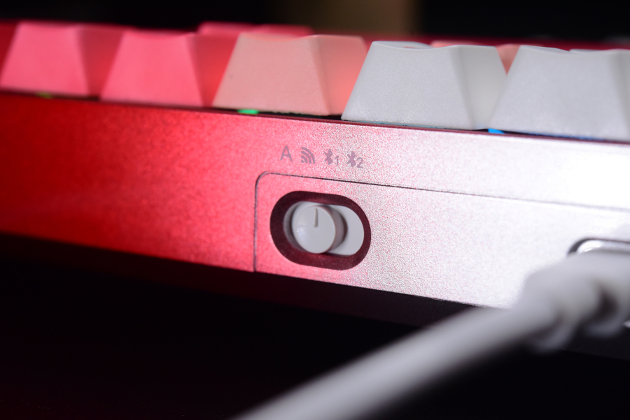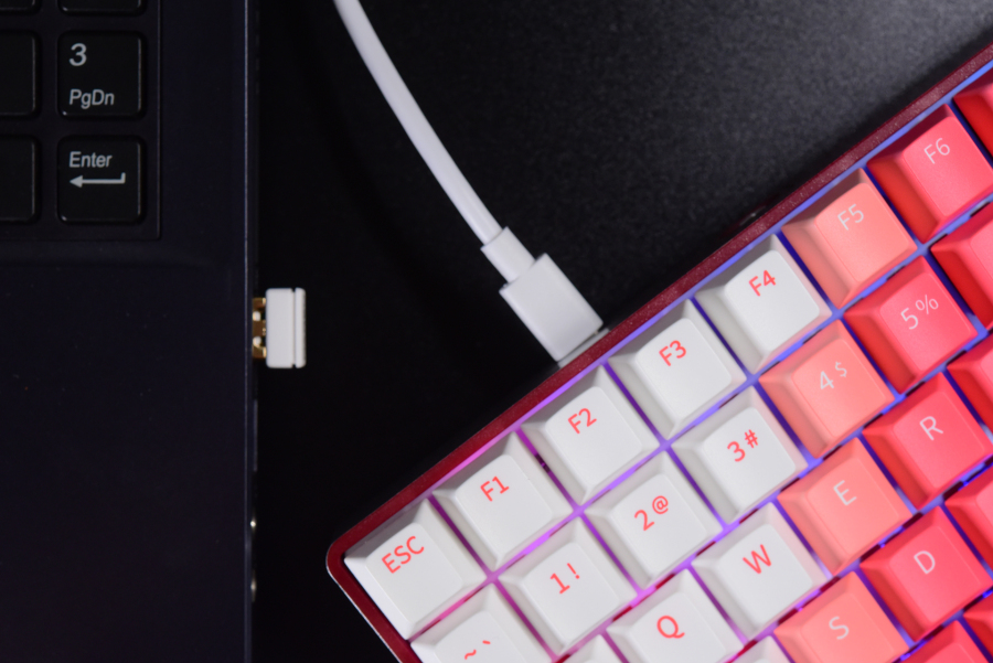 三模连接,除了这里的2.4G接收器和有线Type-C连接以外,还有一个蓝牙,线材居然不是红色的,这就显得有点不搭了,强烈推荐整条红色的连接线搭配一下。