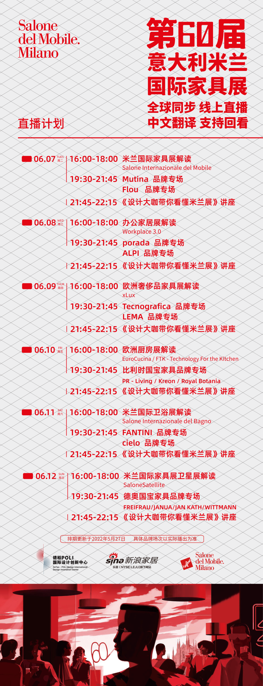 将邀请多位意大利行业著名设计师等知名嘉宾亲自带队,实时直播,专业解读2022年的家居设计趋势与概念。让你边看边学,看有所值,学有所获。