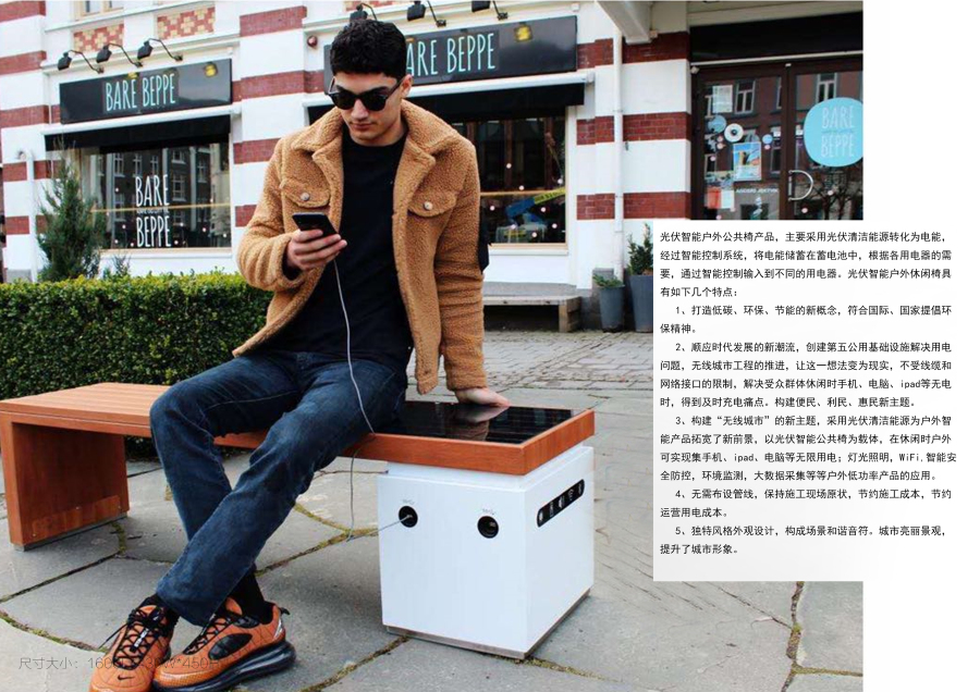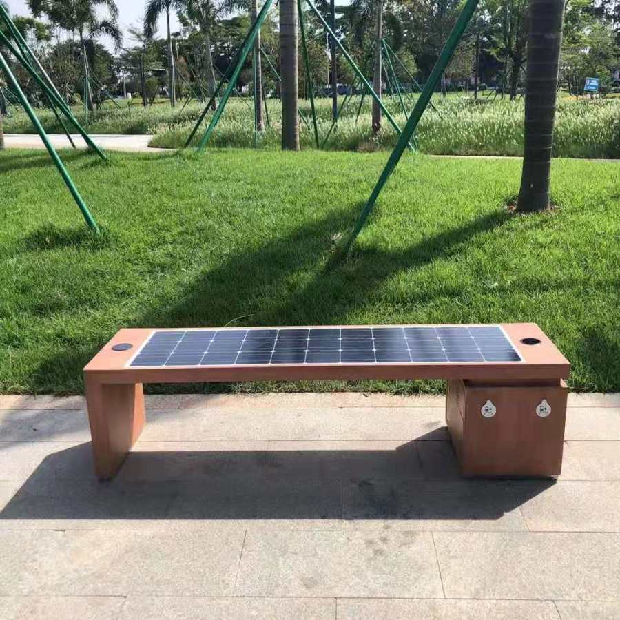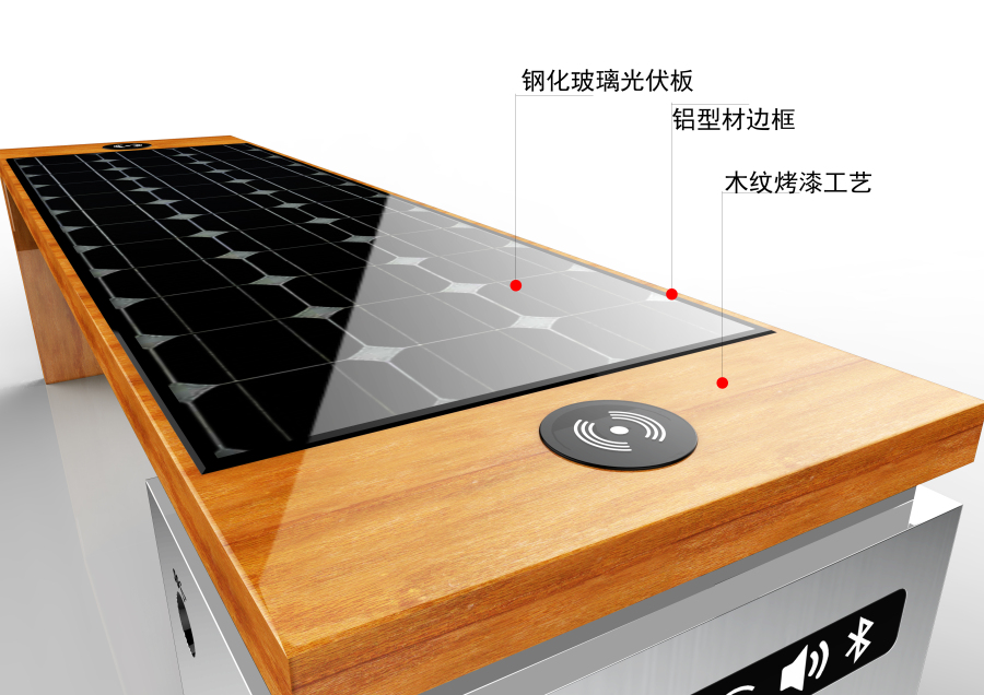 光伏智能户外公共椅的系统工作原理,利用光生伏特效应原理转换光伏电池板.通过光伏电池板接收光的辐射能并转化为电能,经过智能控制器储存在蓄电池中,当各种电器用电时通过智能控制器,控制LED灯与LED灯箱的开启与关闭,USB端口和无线充电器充电与WIFI功能的使用.