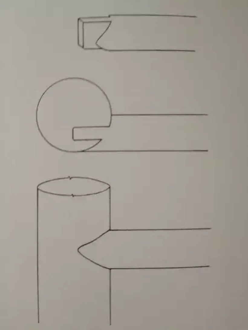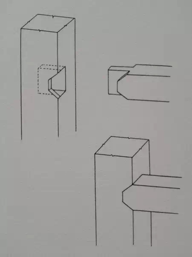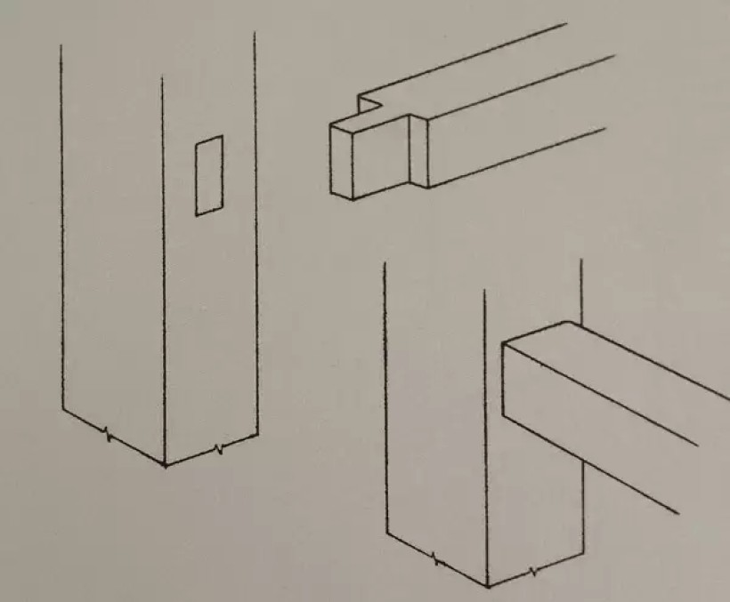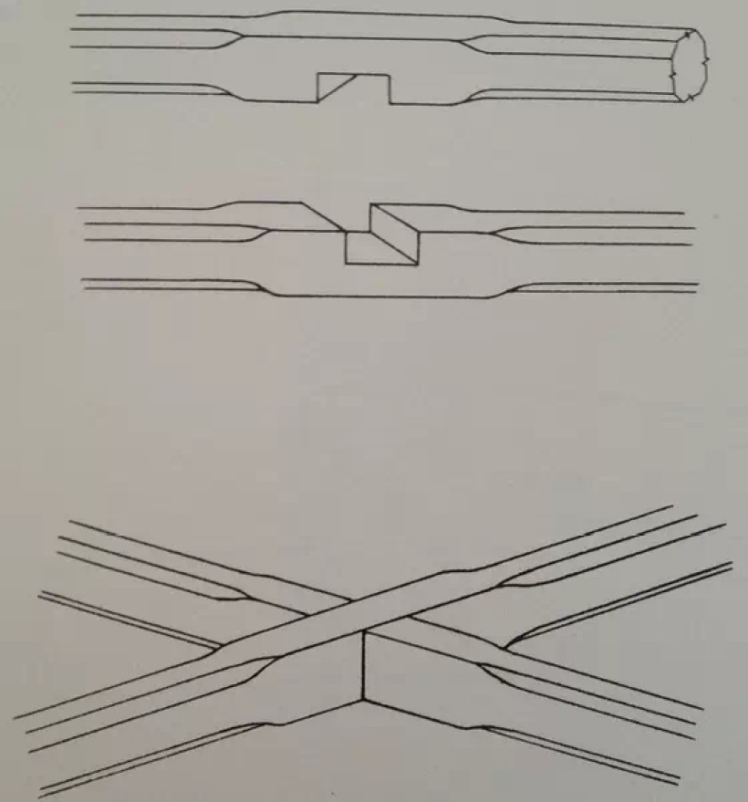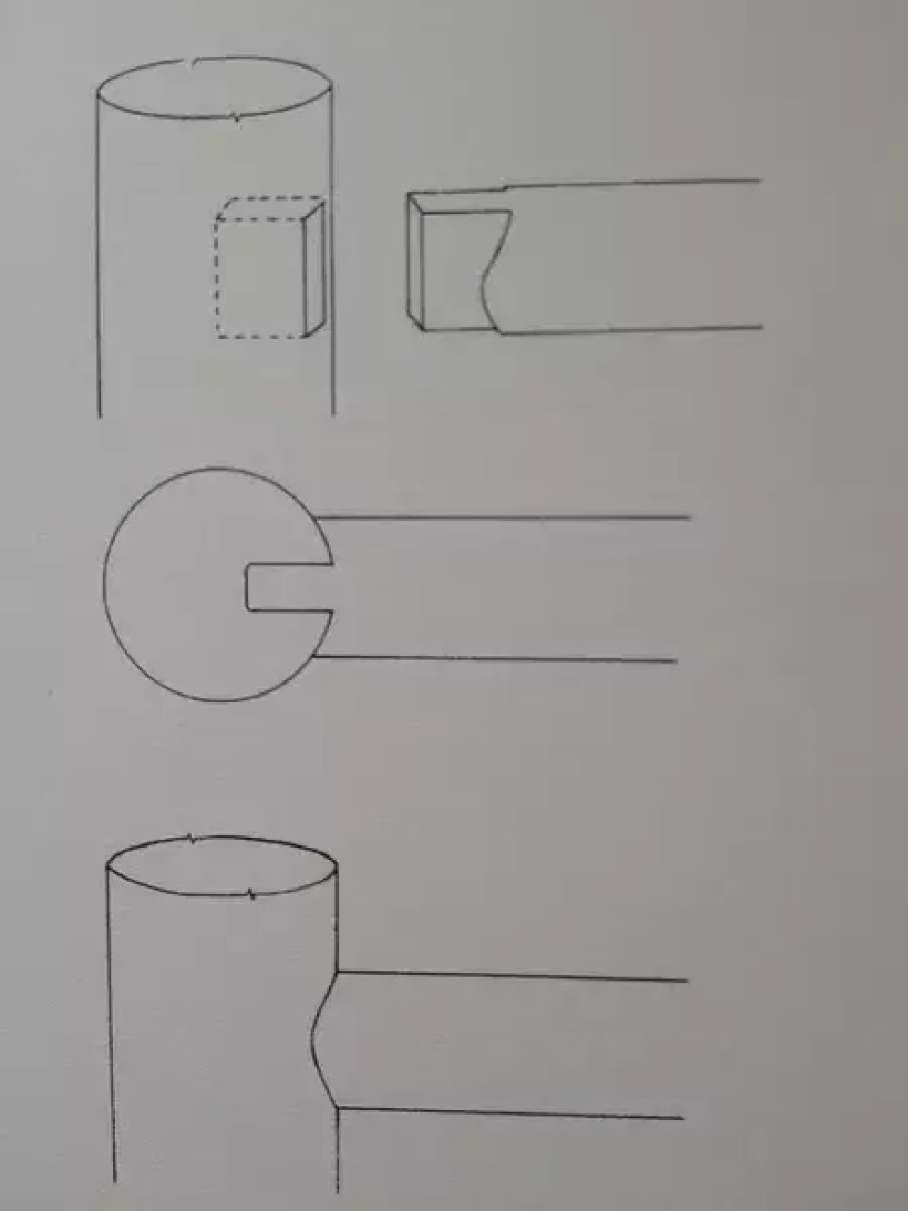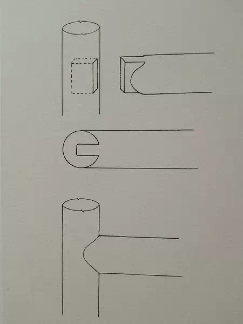 圆材丁字形接合(横材细、竖材粗、外皮交圈、榫卯用蛤蟆肩)