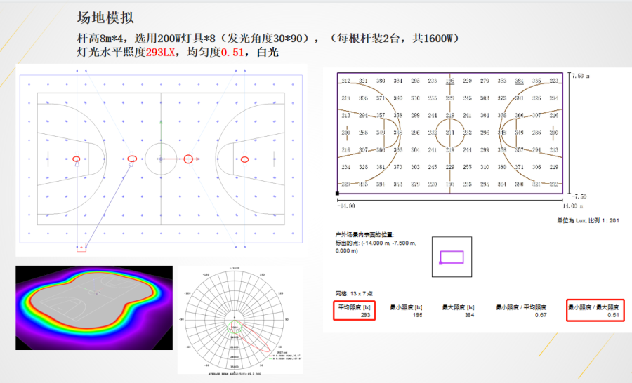 灯杆高度约8米左右,数量4-6根,我是在4灯杆的基础上做设计,选用的是30*90,每条灯杆装两个200W,一共8台,通过数据导入,平均照度293LX(标准是300LX),最小照度/最大照度0.51(标准0.3),所以这个数据效果是很好的。