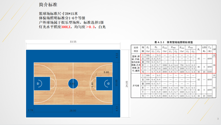 户外篮球场属于娱乐型场所,根据标准选择需要满足的参数,如附图,选用1级即可