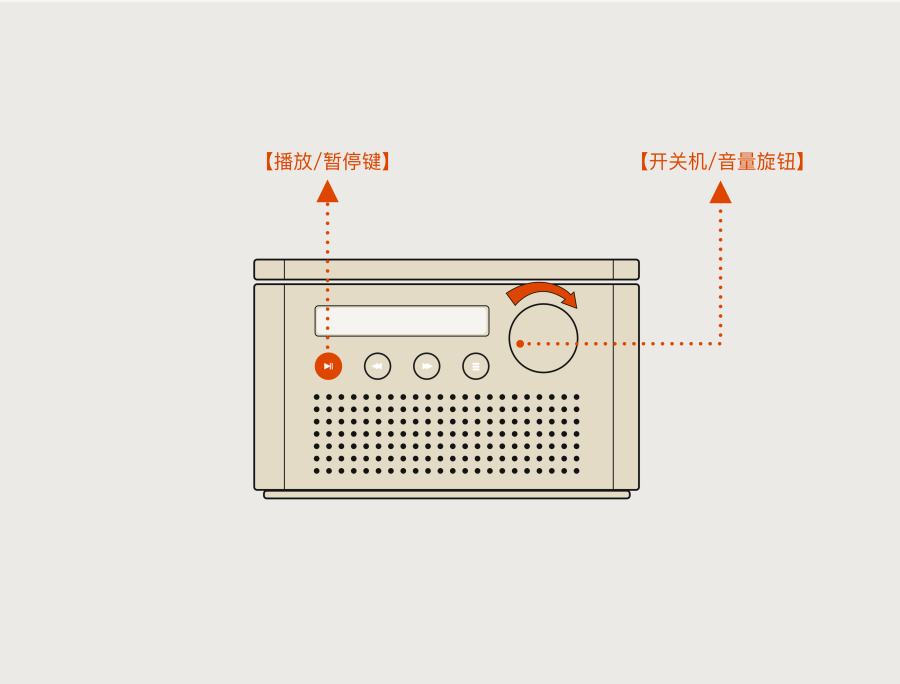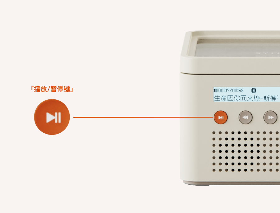 在R200的设计中,跳色并不是为了装饰视觉,而是为了引导操作。我们将最核心的播放/暂停键做了桔色处理,也结合刚刚排布阶段的思路,双重引导用户了解功能。