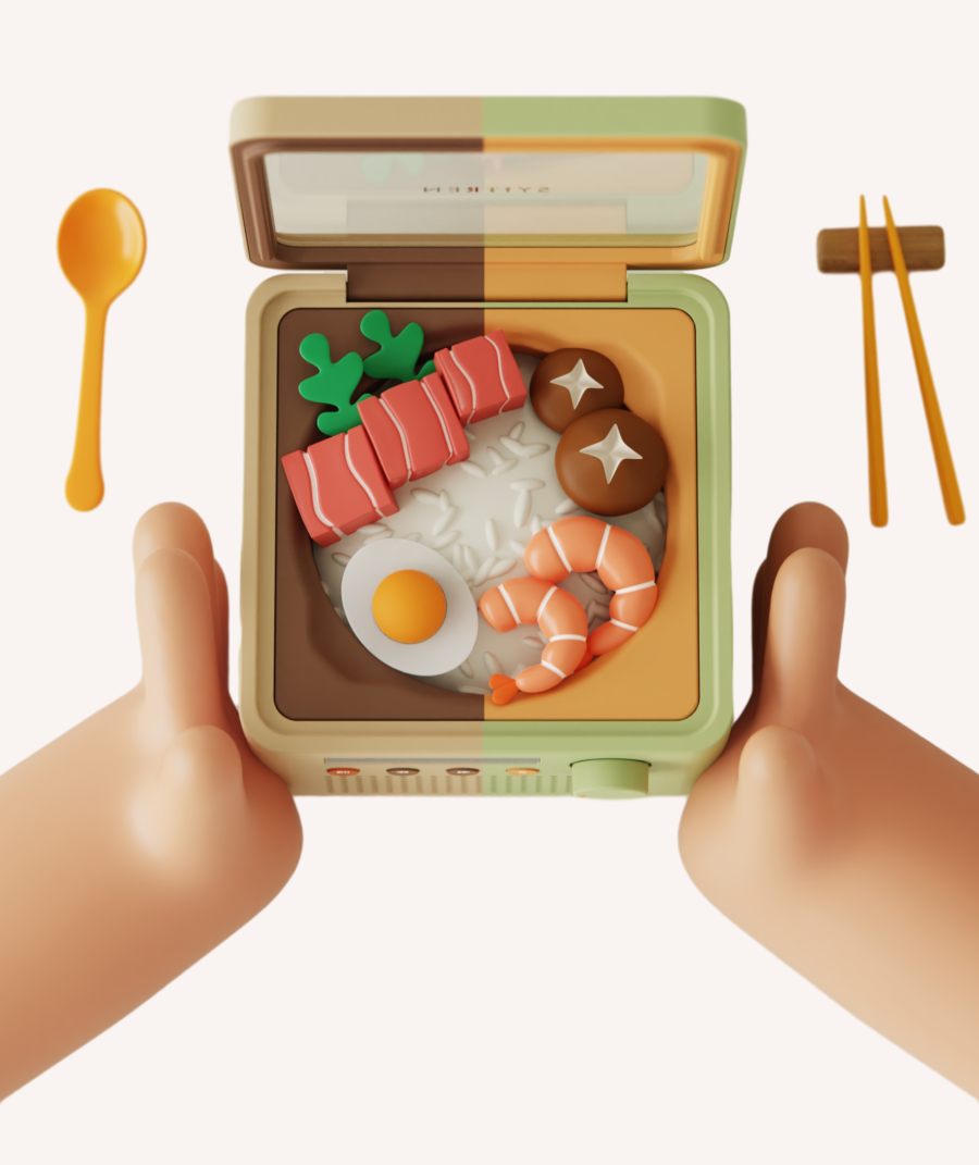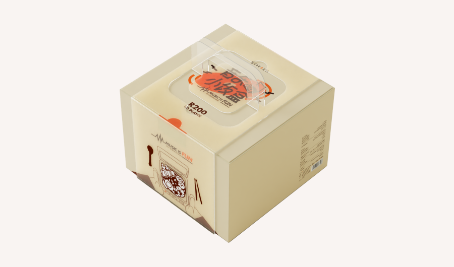 “音乐小饭盒”是我们围绕R200所做的一次特别包装企划。我们在原有包装结构的基础上,增加了一个带透明LOGO的提手,把“饭盒感”落实到了外观上,既呼应了造型,也方便了便携使用。