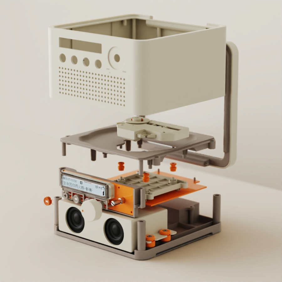 这些理性选择,最终拼出了R200的独特造型:正面的操作区域明确清晰,顶面则为播放CD留足展示空间,而音响则稳稳落于底部。功能被一一安放好位置,整体也自然长成了现在的样子——没有多余线条,也没有刻意装饰,纯粹由需求引导,结果却意外地有了自己的个性。