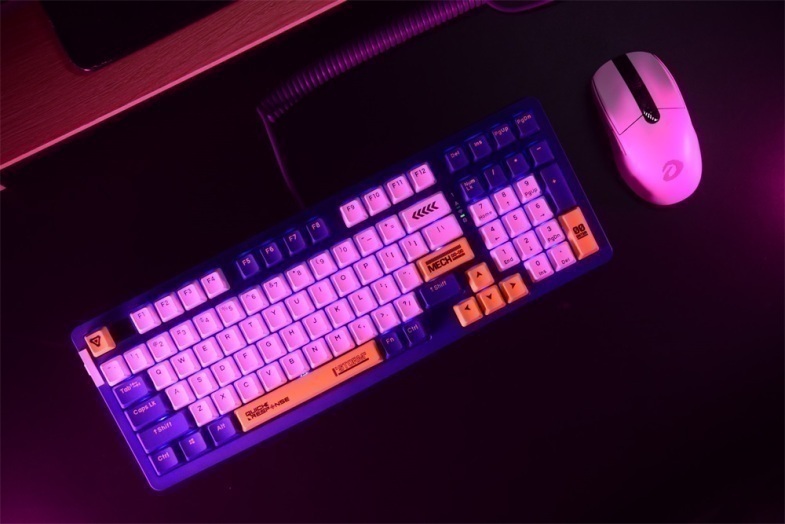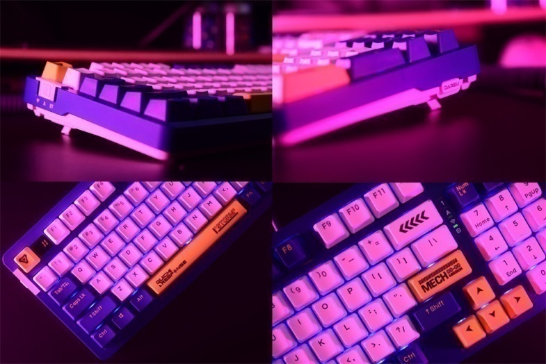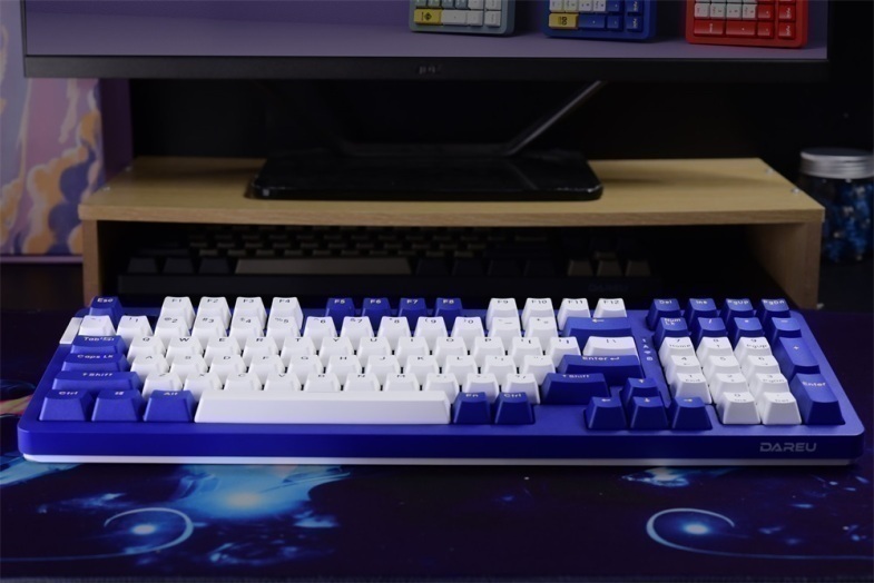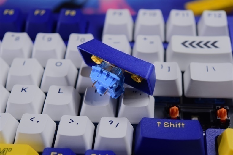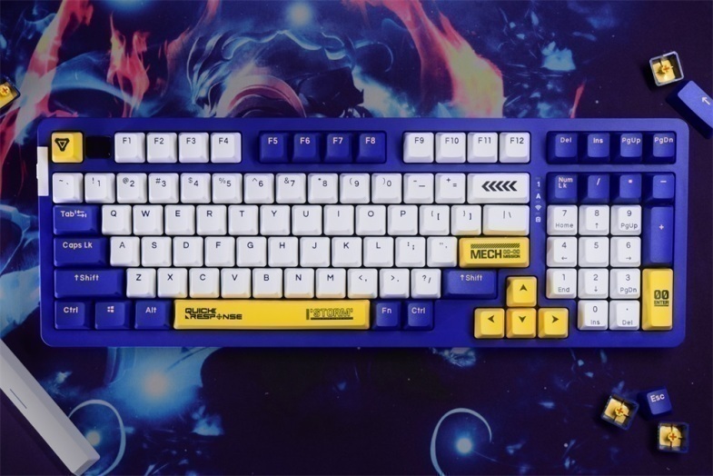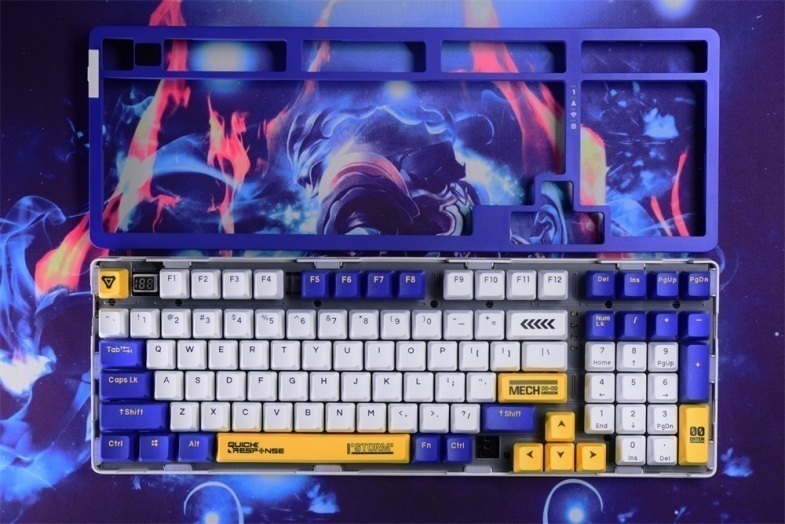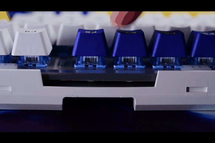 出厂配的键帽是蓝白配色,其实也很简约,好看是好看,但我还是要换回我的机甲版键帽。