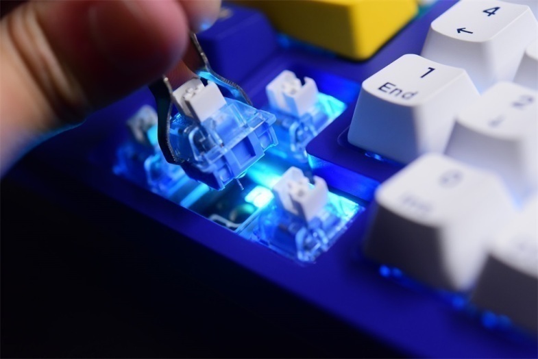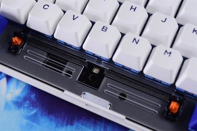 在按键触底的时候不会因为有钢设计而发出较大的敲击声,如果使用的是无声类型轴体,效果对比就会更明显。