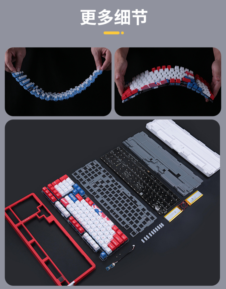 因为拆上盖废了一只手的原因,这次我就不完全拆解了(下次一定)。我们看官方的图片展示可以看到,整个键盘的结构。上盖-键帽-透明PC材质的定位板-消音垫片-PCB板-底壳硅胶垫-底盖。可以说一层又一层,层层叠叠堆起来的一个键盘。而且机身机构都是无螺丝固定的设计,完全靠内胆结构填充,上下盖压紧。