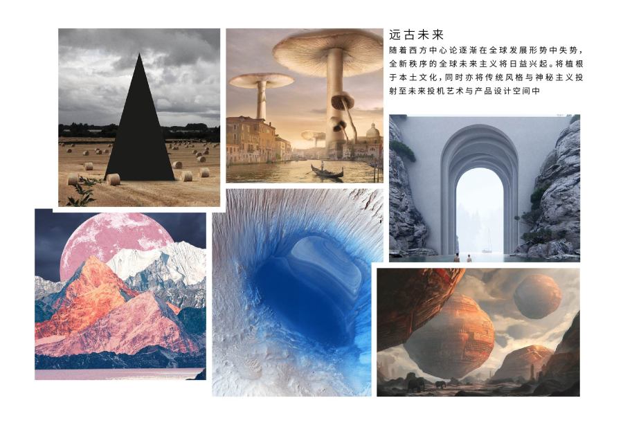 随着西方中心论逐渐在全球发展形式中失势,全新秩序的全球未来主义将日益兴起。将植根于本土文化,同时亦将传统风格与神秘主义投射至未来头投机艺术与产品设计空间中。