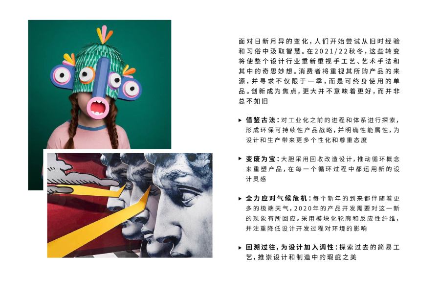 面对日新月异的变化,人们开始尝试从旧时经验和习俗中汲取智慧,在2021/22秋冬,这些转变将使整个设计行业重新重视手工艺的艺术手法和其中的奇思妙想。消费者将重视其所购产品的来源,并寻求不仅限于一季,而是终身使用的单品。创新成为焦点,更大并不意味着更好。