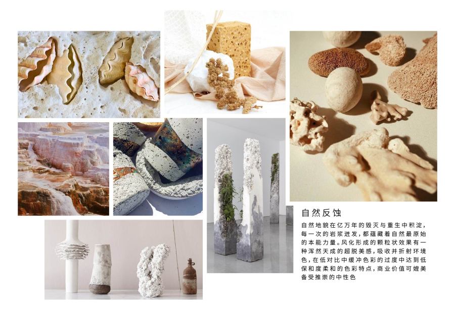 自然地貌在亿万年的毁灭与重生中积淀,每一次的岩浆迸发,都蕴藏着自然最原始的本能力量。风化形成的颗粒状态效果有一种浑然天成的超脱美感,吸收并折射环境色,在低对比缓冲色彩的过渡达到低饱和度柔和的色彩特点,商业价值可媲美备受推崇的中性色。